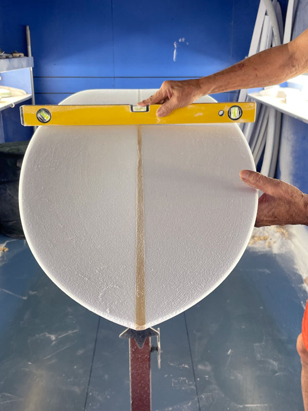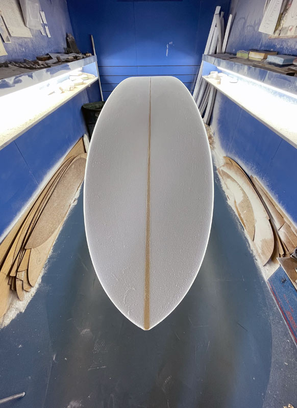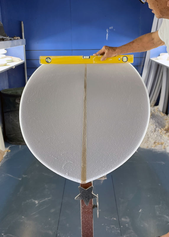 ロッカーは昨年作った10’6”と同じ。ボトムは浅めのコンケーブにしていただこうと考えていましたが、「コンケーブまで行かず、この辺を少しだけとるだけでいいですよ」という活さんにお任せしました。