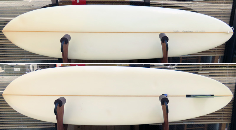 ロングボードなんです。でもよく見ると60年代のいわゆる「ログ」ではありません。ボードは8フィート代後半くらいか9フィートほどで、コンベックスボトムにグリノウフィンがついた、60年代後半に登場した当時のいわゆる「ショートボード」です。