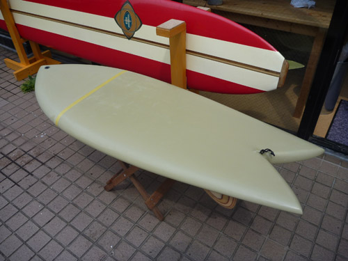 これもありました。ひどいシェイプ(笑)の5’2”の座立両用のフィッシュです(シェイパー:私)GO PRO用にノーズにFCSプラグを入れたのが目立つのでノーズだけペイントしようと、下地作り中です。かなり短いですが、小波で立ち上がって乗ると、フィンの位置が変なので面白いのです(もちろんニーボードとしてもOKです)