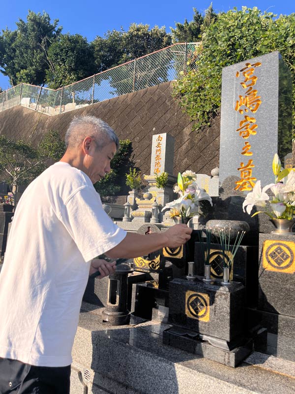 6年ぶりです。きれいに掃除して、本当だったらお盆に備えて提灯を吊る竿を組み立てるのですが、もうお盆に来る人もいません。長崎では提灯をたくさん吊るして、お墓で花火をするのです。子供の頃はそれが楽しみでした。