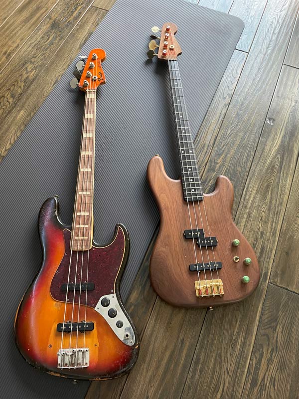 左は高校生の頃に中古で手に入れた、フェンダーのジャズベース。1970~73年に作られたヴィンテージです。状態が良ければかなりいい値段で取引されているみたいです。フレットが削れて凹んできたので抜いてフレットレスにしちゃいました。