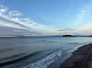 日の出直前。冠雪し始めた富士山の頂が赤く染まって、赤富士になってます。いくつかの台風を経てきましたが、ビーチの砂はたっぷりと残ったままです。いつもの冬の海が戻ってきた感じです。