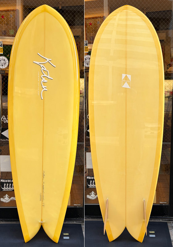 それから、二本目のフィッシュがこのイエローの5’10”です。ハワイでクリステンソンがシェイプして、ジャック・リーブスがラミネートするけど何か頼む?と連絡をもらい、それじゃあとオーダーした記憶があります。スキップ・フライがレイカーズファンだと聞いたので、イエローとパープルのレイカーズカラーにしてもらいました。