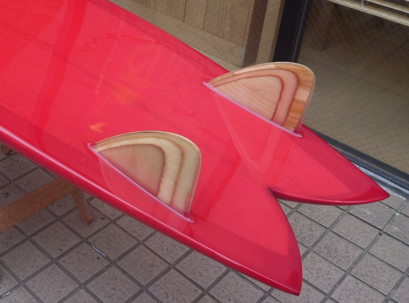 パッドは貼ったので、次はこのチャネルボトムとツインフィンです。同じシェイプのスタンディング版は6’6”ですが(このニーボードは5’8”)、そちらはとんでもなくスピードが出ているようです。