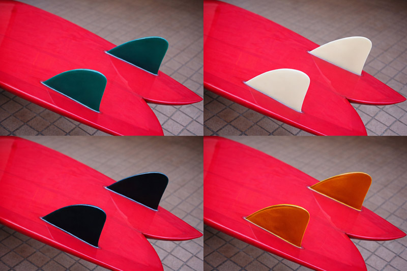 気になるのは「色」だと思います。ベージュのサーフボードが欲しければ着色不要ですが、他のカラーは素地の影響が出ないオペークピグメント(不透明)の着色になってきます。ティントは混色します。(上の9’6”グライダーのレール部分はボトムの薄いベージュの上にグリーンが乗った発色です)