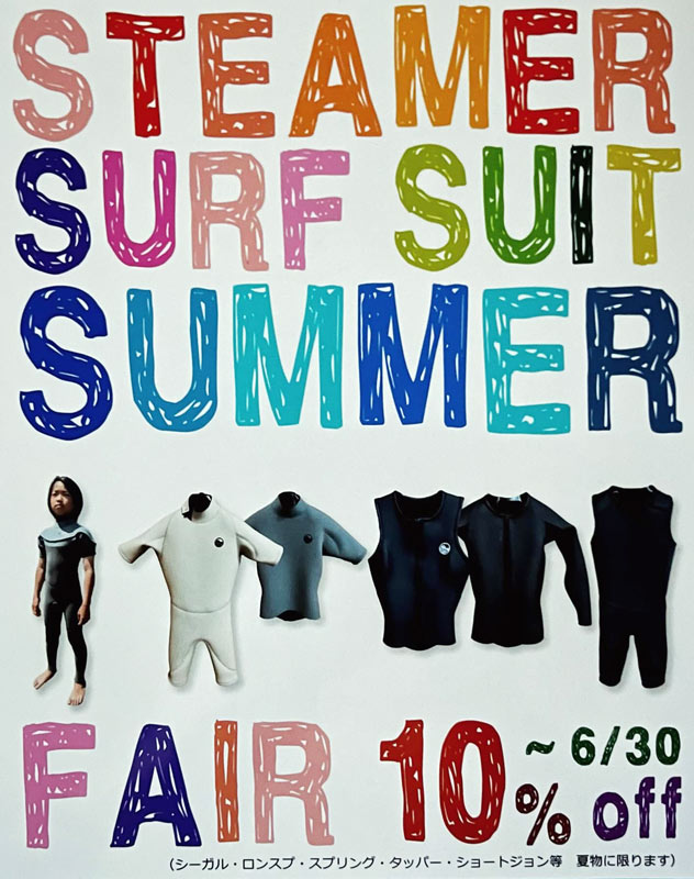 STEAMERは、定価より10%オフになります。シーガル、ロンスプ、ロングジョン、ショートジョン、タッパー類が対象です。(現在、すでにオーダーいただいて製作中の方も対象になりますのでご安心ください)