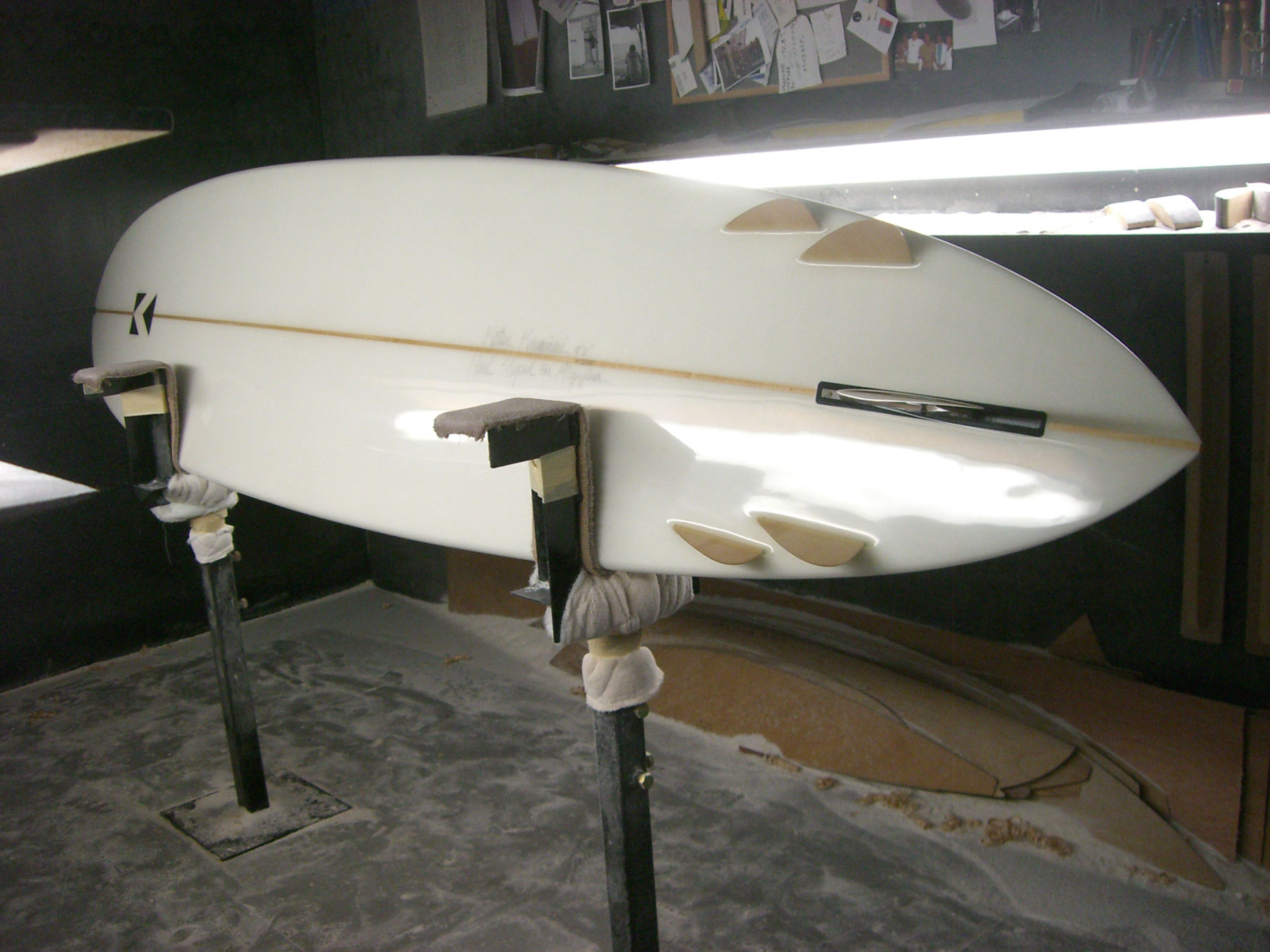 オーダーいただいたニーボードのシェイプが出来上がりました。レングスは5’8”です。ストリンガーを整えて完成です。
