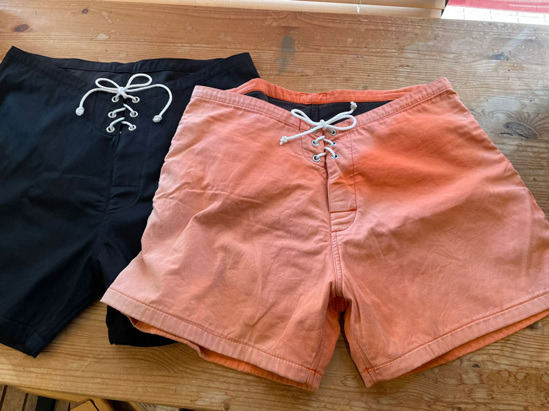 長年履き込まれ、いい感じに色落ちしたNALUTOトランクスのTHE BANDです。裾の縫い目に入り込んだ砂を出して、破れたところを修理して、新しく同じ形の色違いでオーダーいただいたTHE BANDと一緒にお送りします。