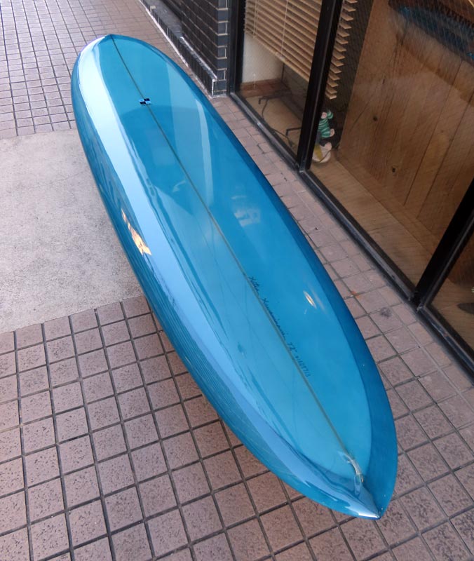 正面から見るとこうなります。68-9年にシェイプされたボードの復刻です。シェイプは当時のオリジナルをシェイプした川南正さんによるものです。