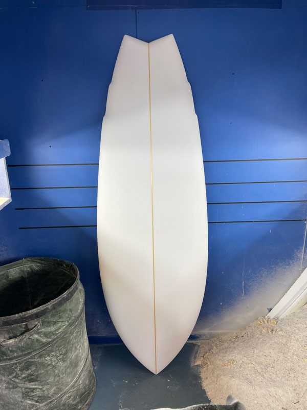 ボトムはノーズから緩いシングルコンケーブで入って、センターの少し前くらいからフラット。そこからテールにかけて緩いVEEと書かれています。レールは最近また盛り上がっているダウンレール。同じ形のロングボンザーをオーダーいただいて数本作っています。