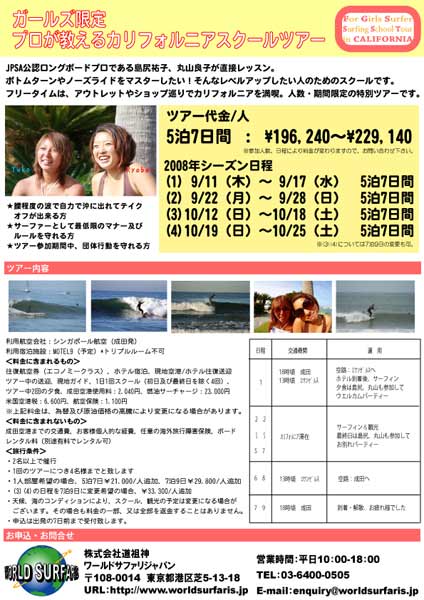 それからお世話になっているワールドサファリさんからのお知らせです。このブログをどのくらいの女性の方が見ていただいているかは不明ですが、女性限定カリフォルニアサーフスクールツアーのお知らせです。追加:お問い合わせ先はホームページをご覧ください
