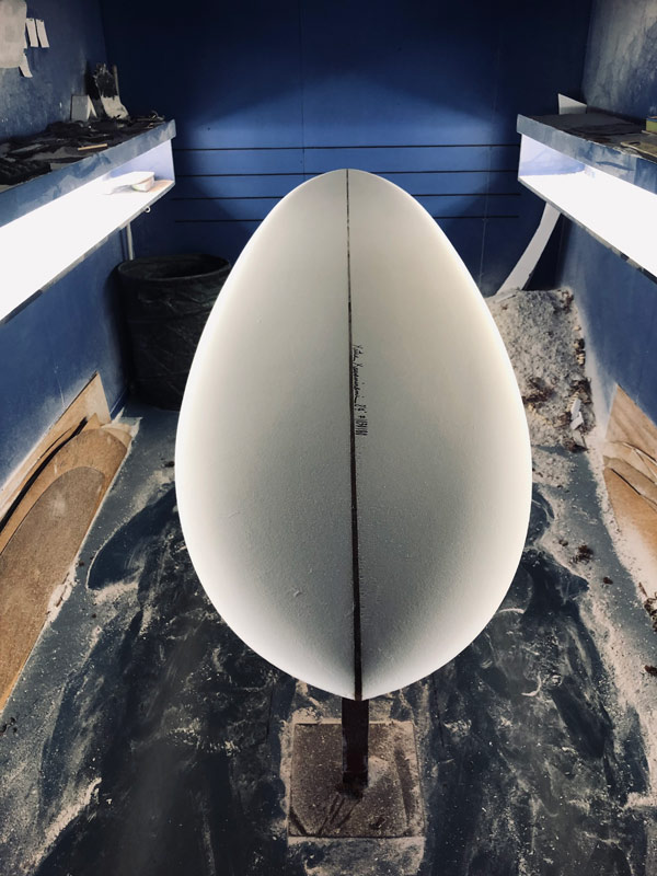 フルハンドシェイプとラミネートは、どちらもスピードアップが難しい作業です。一本ずつ時間をかけてシェイプして、高いクオリティでグラッシングしています。長い付き合いになるサーフボードです。少しだけご辛抱お願いします。