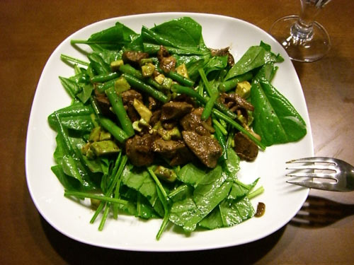 材料:アボカド レバー インゲン ほうれん草 オリーブオイルとバルサミコ酢。レモンでもおいしい。