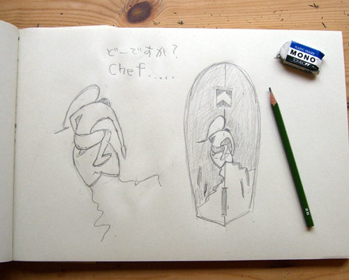 シェフ!イメージ消えないうちにスケッチしてみました。ニューボードのペインティング、こんなのどーですか?イメージはシェフご本人です。背中を丸め気味にテイクオフしていくのが印象的なので、そのままチューブに入っていただいた次第です。細かいところは今度お会いしたときにご説明します。