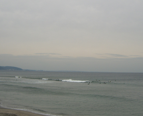 アウトに出たとたんちょうど来たセット。「どーぞー」と声がかかったので遠慮なくレフトへテイクオフ。よろよろと立ち上がったらそこはボトム(笑)。件(くだん)の体勢を意識しつつボードに立つと、掘れ気味のフェイスに戻ってレールが入って走りはじめます。カットバックを二回入れてインサイドでプルアウト。なんだか今日こそはこのボード、乗れそうな気配。