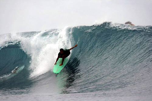 こっちはリーフブレイク用に削った7.6トライフィン。ライダーは某旅行会社の方。サーフツアーをやっている旅行会社とのことですがOKが出れば後ほどご紹介します(確か昔名刺をいただいた記憶が…スイマセン)。こんなツアコンがいる会社なら間違いなし?!