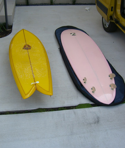 アンドリュー・キッドマンの5.8フィッシュとカツさんの7.7のクアッド。カツさんの7.7は滑らかにコンケーブを入れてもらっているので画像ではよく見えませんがシングルコンケーブからボンザー顔負けのダブルコンケーブが入ったすごいボトムです。速くてよく動いてくれるいろんなコンディションで使えるボードです。