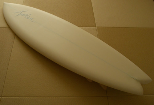 うすいベージュのピグメントにウッドのサイドフィン、センターはブルーのティントのグラスフィンをつけてくれました。サンディングフィニッシュで柔らかな感じの出来上がりは狙い通りです。後ほど改めて詳しくご紹介します。