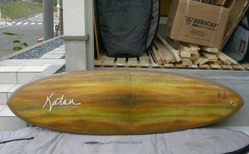 カツさんのシェイプルームにあったシェイプできたてのボード。茅ヶ崎スポーティフカフェのシェフさん(お元気ですか~?)のボードです。5’8”ダイアモンドテールのクアッド。小波からオーバーヘッドまでいろんな場面で楽しめそうなボードです。