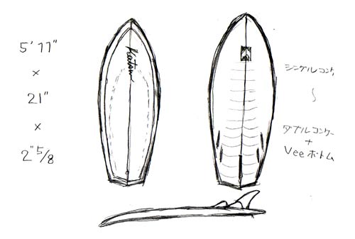 ダイアモンドテールに5フィン。70年代初頭のボンザーのプロトタイプのイメージと一昨日観た「MORNING OF THE EARTH」でMPが乗っていたエッグぽいシングルフィンのイメージ。ワイドテールになりそうなので短めにして5.11。幅広テールとテールのラインが直線的になりそうなので短い方が良いような気がします。ボトムシェイプも動かしやすいようにVEEにダブルコンケーブを浅めに入れると良さそうです。