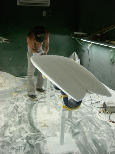 昼飯休憩に昨日は10個たいらげたというフライドチキンを6個食べ、コークを飲んで少しだけ休憩したらシェイプ再開の働き者。フィッシュを削るところをシェイプルームに入り込んで見せてもらいました。6.3の少し長めのフィッシュ。シングルコンケーブが良く判ります。