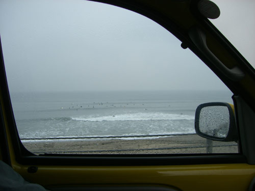 波はヒザ。待っていればたまにコシくらいのセットが入ってくるスモールコンディション。地元の顔見知りのオヤジがひとり入っています。彼もカツさんのMINIに乗っています。