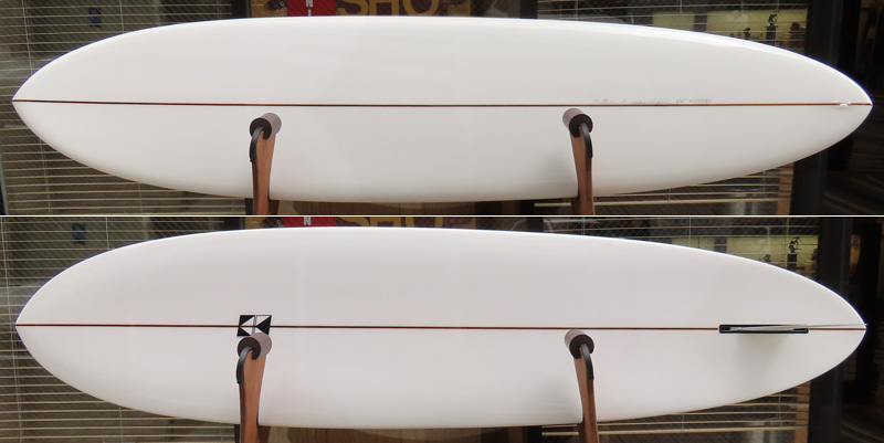 フィンのセッティングも様々ですが、オリジナルはマリンプライウッドを使った、ダブルフォイルのキールフィンです。そのフィンをストリンガーに平行に、ボトムに対しては垂直に付けられます。