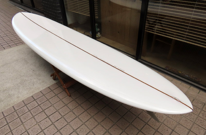 MINIモデルが入荷しました。ストックボードです。サイズは6’8”x22”x2”3/4。亜麻色のピグメントでラミネートして、クリアのデッキにはボランクロスでパッチを入れました。