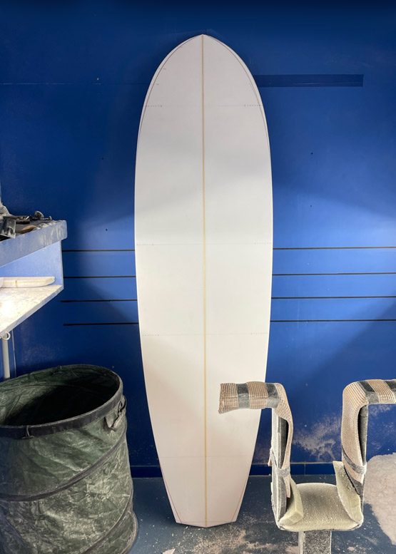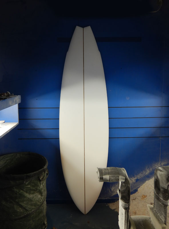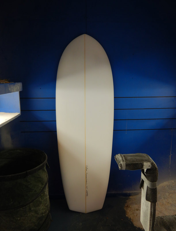 いつもはシングルフィンで使うブランクスで作ったボードがとても調子が良いらしいので、それと同じにシェイプした二本目のテストボードです。レングスは6’4”。フィッシュよりもノーズは細く、センターからテールまではしっかりと幅があって、テールは大きめのスワローテールです。