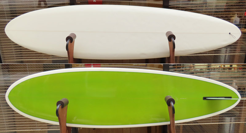 ラウンドピンはもう一本、ボリューム多めで6オンスラミネートのしっかりした重量のものを一本持っています。これも面白いのですが、今回のラウンドピンは4オンスラミネートで薄く軽く、ロッカーも違うので、ボードの性格も変わってきます。実際に乗ってみないと分からない部分ですが、どんな世界を見せてくれるのか楽しみです。