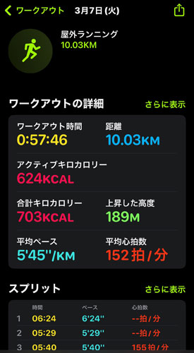 10キロ集中した後、2キロほど流して終了。まあなんとかです。競技に出るのをやめてから時間は気にしていませんでしたが、タイムを測ったほうが目標ができて自分をプッシュできます(全然、速くありませんけど)。累計で189メートル登ってます。