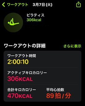 ピラティスはゆっくり2時間。ストレッチマットの上でやります。息が切れるくらいのエクササイズのときには心拍数は100を超えます。