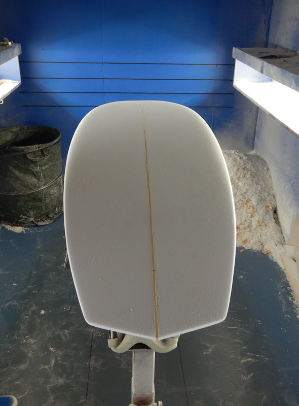 この角度と光線で見ると、ダウンレールの曲面がボード全体をきれいにまとめているのが良く分かります。活さんお得意のシェイプです。