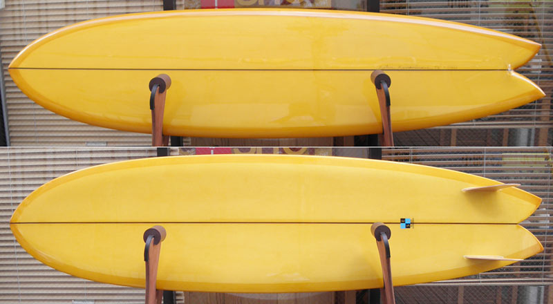 フィッシュ同様、ストレートなアウトラインはスピードが出ます。フィッシュほどテールが沈みこまない幅が広めのスワローテールでスムースにカーブするフィンのセッティングになっています。