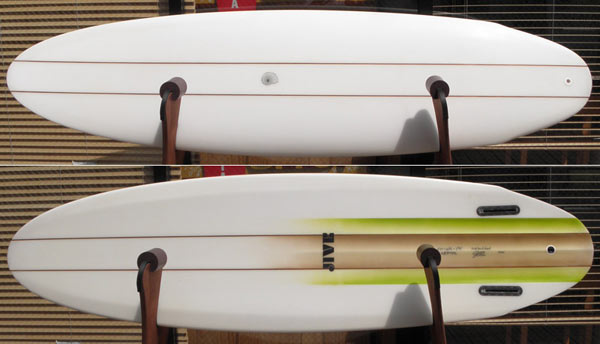 何が違うのかというと、ロッカーが違います。8’4”のプリモはお気に入りの一本ですが、8’4”のブランクスからフルレングスを使って作られています。8’1”のサイズの理由は、新しく使い始めた8’2”のブランクスです。このブランクスでフルレングスで作ると、8’1”になるのです。