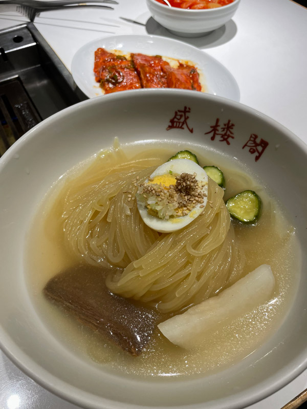 ひと口食べた感想は…なんかぼんやりした味だなあ、と。それでも麺はとても美味しい、でもなんだかぼんやりしてます。これは冷麺の勝ちかと最後はテーブルの上に置いてある生卵を割ってそこにスープを入れてもらって飲みますが、やっぱりぼんやり。